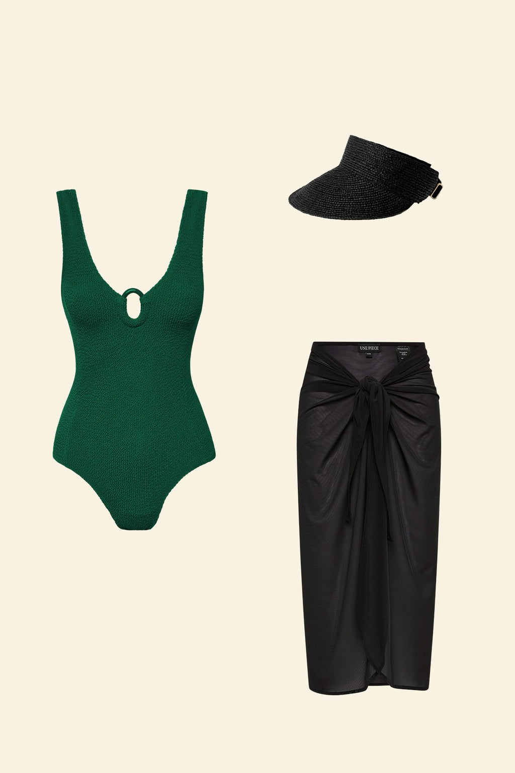 The bundle includes the Crinkle Cut V-Neck One Piece with Ring in Forest Green, the Midi Mesh Sarong in Black, and the Madagascan Raffia Visor in Black.
