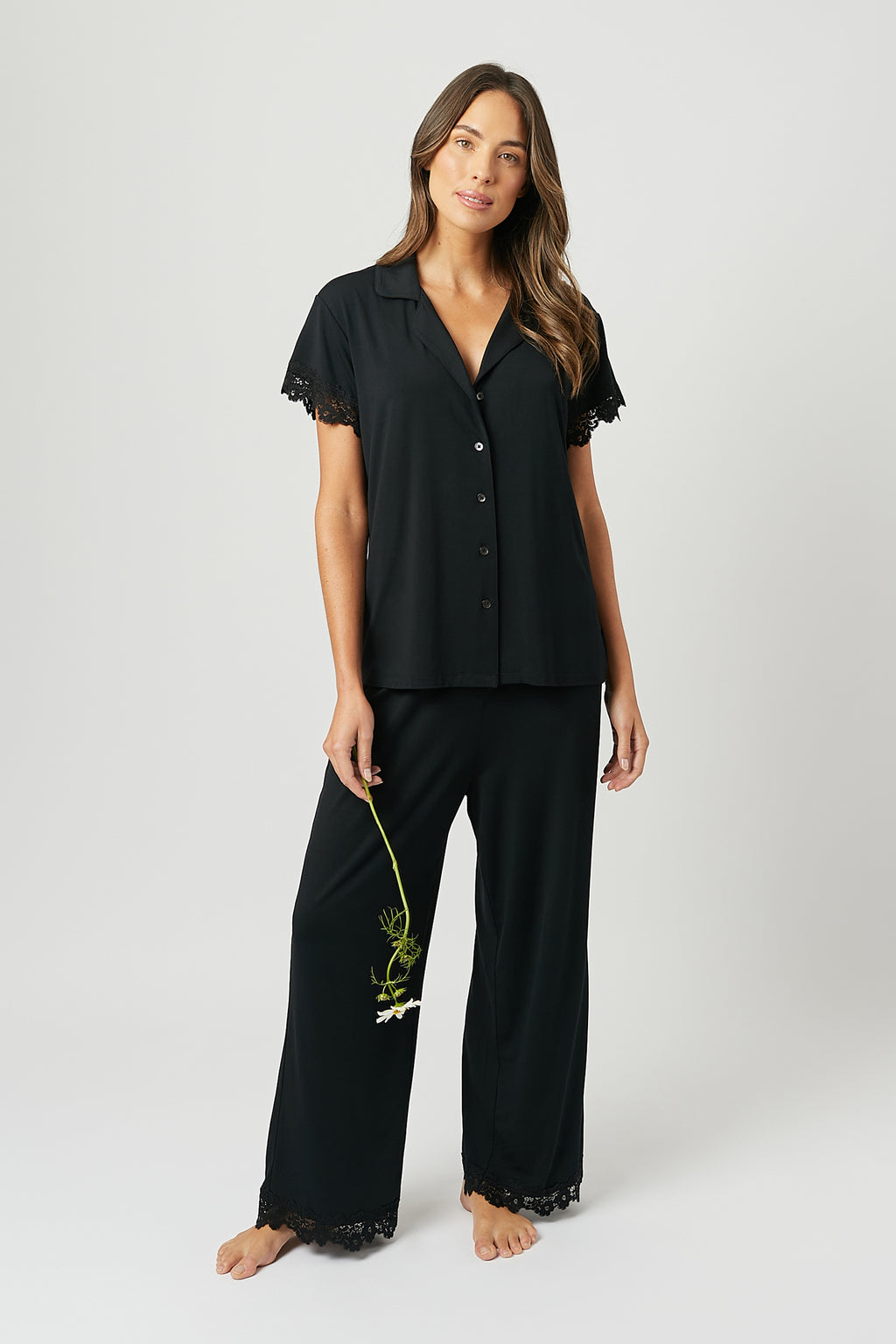 Indulge in ultimate comfort and luxury with our Lace Trim Modal Full Length Pyjama Set. The butter-soft modal fabric and super-soft stretch lace details are timeless and chic yet cosy, perfect for lounging at home. Features button down top and pants with elastic waistband.