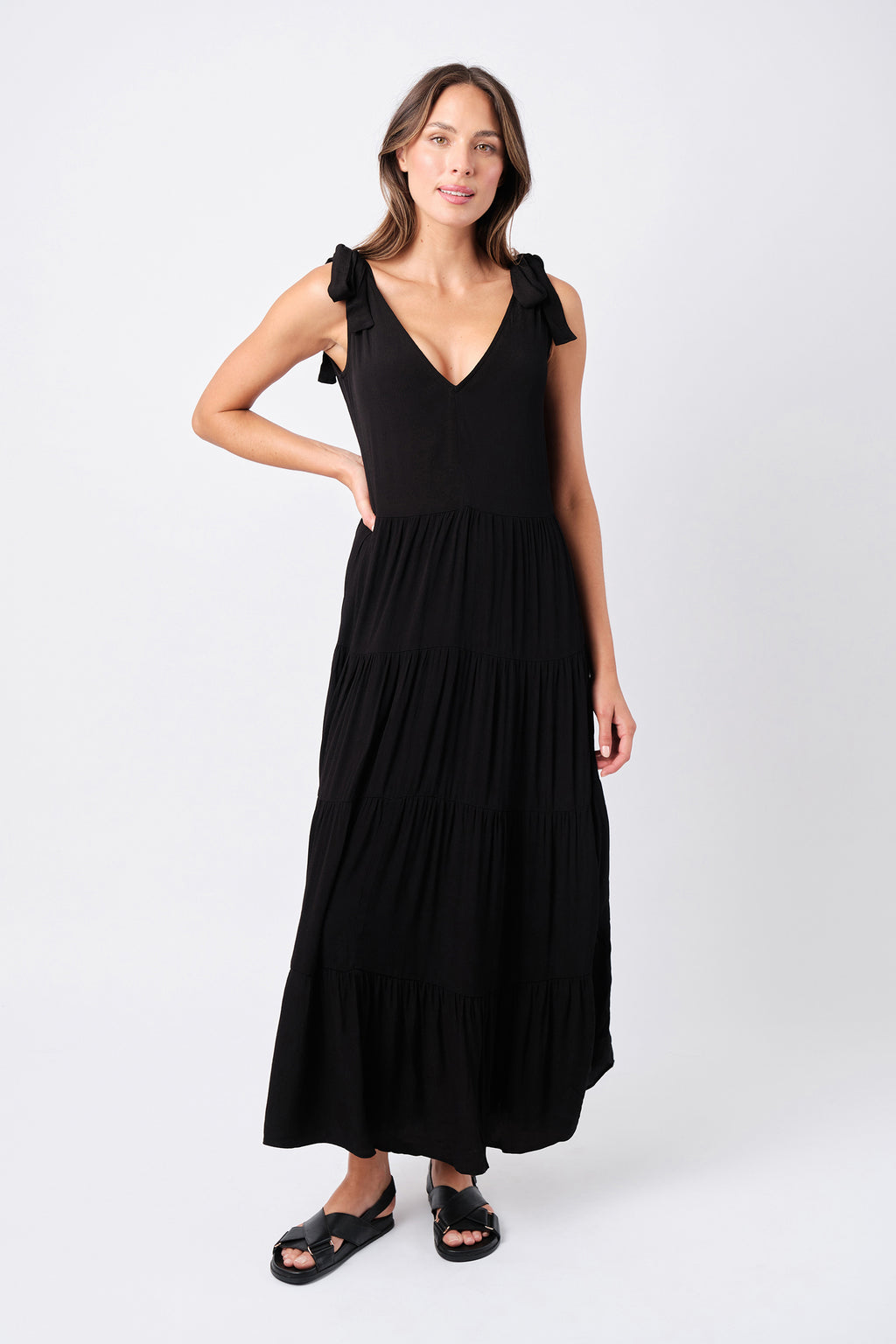 A wardrobe staple. This flattering maxi dress features a V-neckline and a tiered skirt. Crafted from soft and breathable fabric that moves with you. Features removable bows and waist tie for a variety of looks.