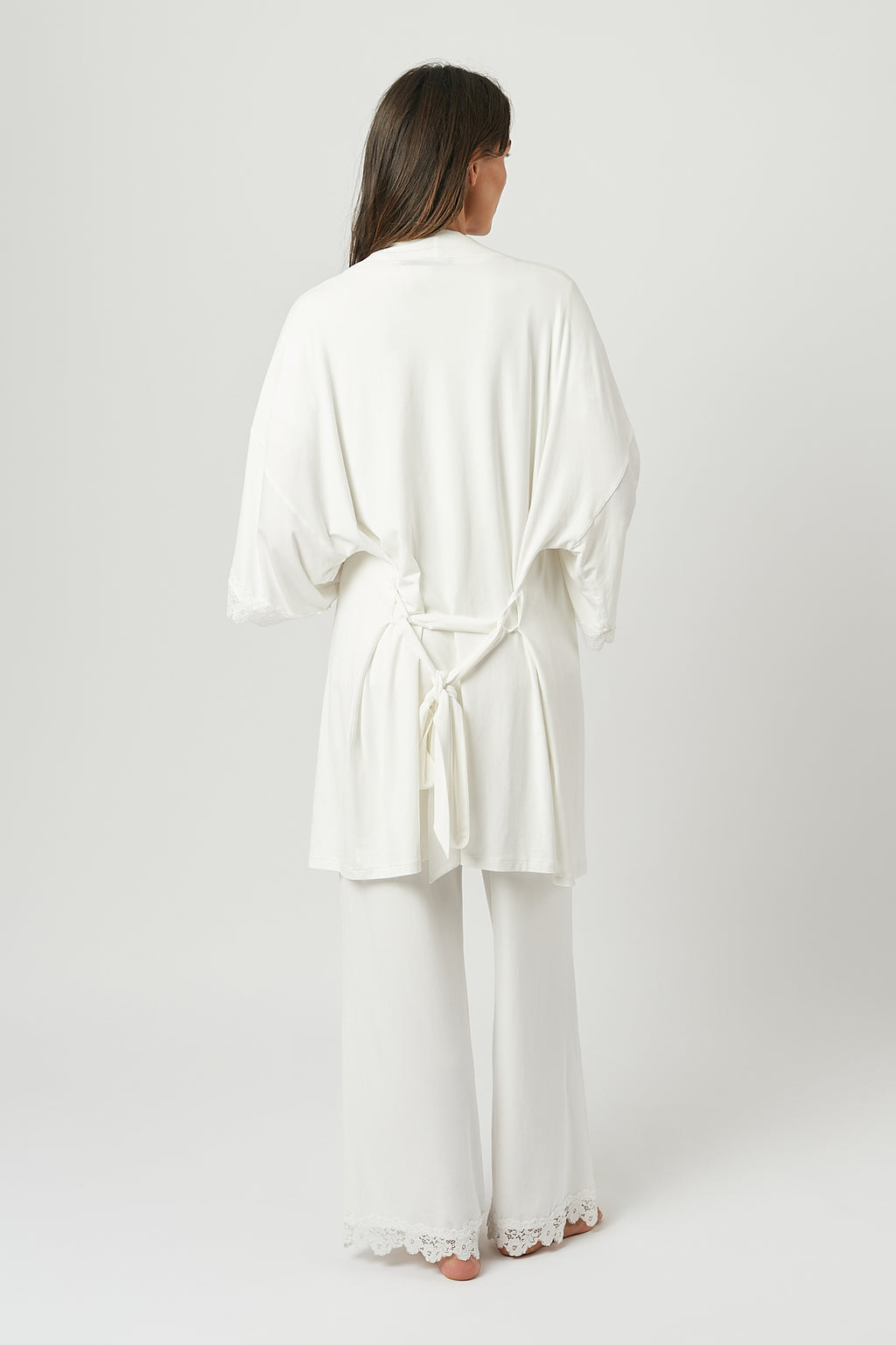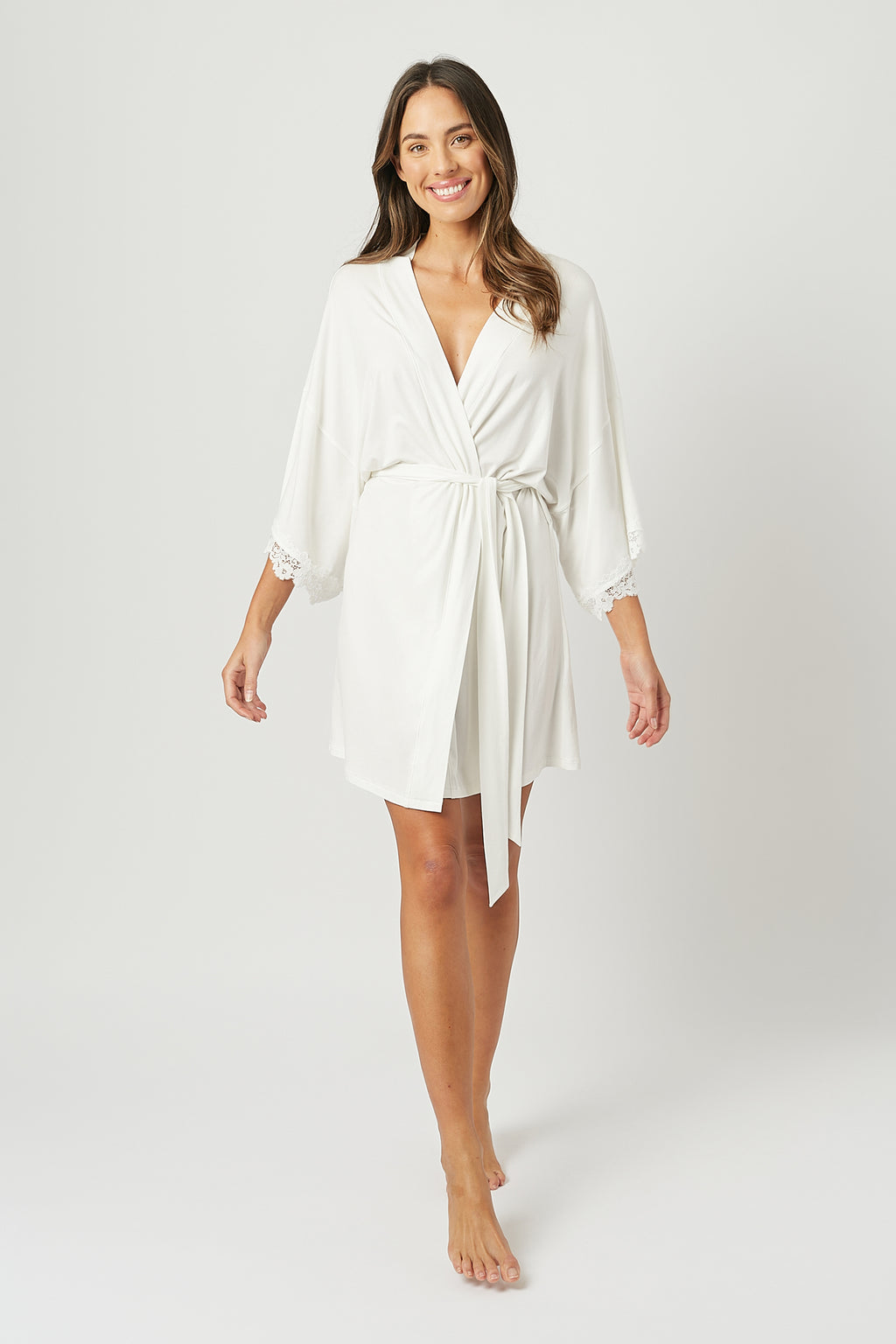 Indulge in pure luxury with our Lace Trim Modal Robe.Crafted from butter-soft modal fabric with super-soft stretch lace details and an adjustable waist tie, this robe drapes beautifully and exudes elegance.Designed to pair perfectly with all pieces in the Sleepwear Collection.