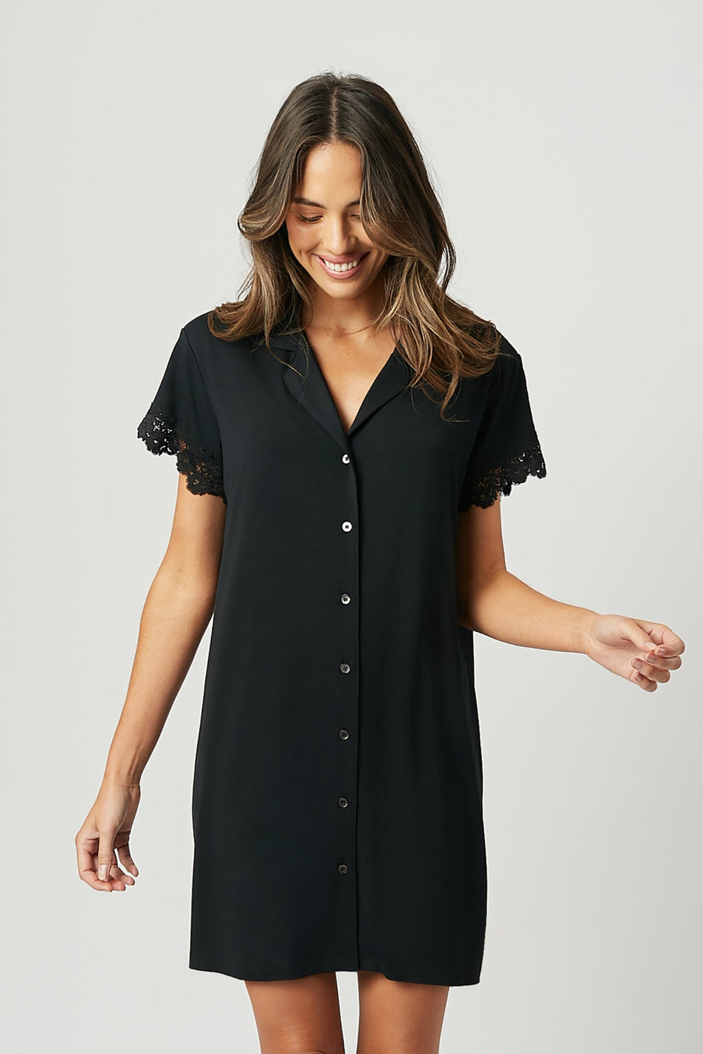 Crafted from butter-soft modal fabric with super-soft stretch lace details, this elevated and elegant Sleep Shirt Nightie will feel like a dream on your skin. Features button down front and timeless collared design.